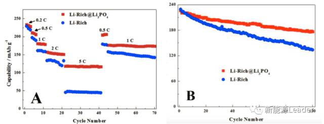 華南師范大學(xué)的Dongrui Chen等[5]借助聚多巴胺模版法,利用Li3PO4對富鋰材料進(jìn)行了包覆處理,Li3PO4包覆層的厚度僅為5nm左右。Li3PO4包覆層極大的改善了富鋰的材料的循環(huán)性能,0.2C,2.0-4.8V循環(huán)100次,容量保持率為78%,而沒有經(jīng)過包覆處理的富鋰材料容量保持率僅為58%,同時(shí)Li3PO4包覆層也顯著提高了富鋰的材料的倍率性能,如下圖所示。