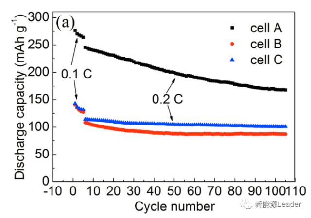 循環(huán)性能研究顯示,雖然低溫導(dǎo)致富鋰材料的容量發(fā)揮較低,但是卻顯著的提升了富鋰材料的循環(huán)性能,如下圖所示(電池A在25℃下循環(huán),含有較多數(shù)量的Li2MnO3,電池B,在低溫-20℃下循環(huán)含有較少數(shù)量的Li2MnO3,電池C首先在25℃下活化,然后在-20℃下循環(huán),含有數(shù)量較多的Li2MnO3)。