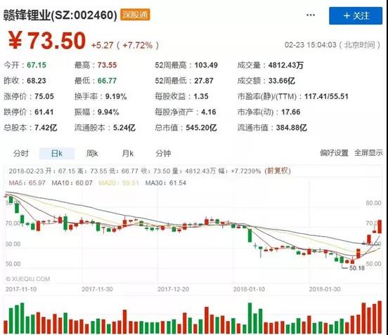 以“鋰電雙雄”——贛鋒鋰業(yè)和天齊鋰業(yè)為代表的A股鋰電上市公司,從2017年9月12日創(chuàng)出高點以來,便開始步入深度調(diào)整。贛鋒鋰業(yè)從2017年的9月12日每股103.5元至2018年2月7日最低點50.18元,股價已經(jīng)腰斬。從2月8日至2月23日,該股放量走出七連陽,僅7個交易日股價累計漲幅超過40%。天齊鋰業(yè)的波動率稍低一些,但也走出了幾近相同的趨勢。在時間上,“鋰電雙雄”股價快速攀升和2018年補貼新政的落地,兩者高度吻合。