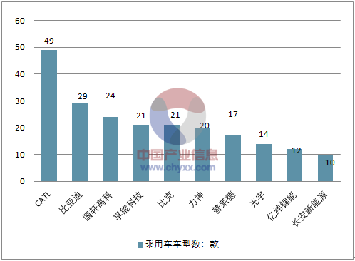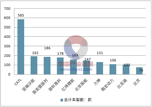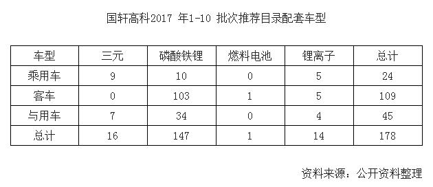 2017 年前10 批目錄中共有146 家不同的電池供應商匹配了2949 款車型,其中前十大電池廠商匹配了1860 款,占比68%,行業(yè)集中度高。龍頭CATL 共配套了 585 款車型,排名第一;堅瑞沃能、國安盟固利和國軒高科分居第事、三、四位,各配套了192 款、186 款和178 款車型。在乘用車方面,前三名CATL、比亞迪和國軒高科分別配套了49 款、29 款和24 款車型,較多的乘用車配套車型數將為公司動力電池組的銷量帶來保障。