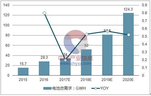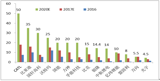 近兩年動力電池企業(yè)紛紛快速擴張產能。政策方面,國家頒布的《促進汽車動力電池產業(yè)發(fā)展行動方案》(2017.3)明確要求到2020 年動力電池行業(yè)總產能超過1000 億瓦時,形成產銷規(guī)模在400 億瓦時以上、具有國際競爭力的龍頭企業(yè)。2016 年新能源車產銷量約52 萬輛,同比增長約52%,對應動力電池需求約為28.3GWh;2017 年新能源汽車產銷量估計可實現70 萬輛以上(同比增長35%以上),則動力電池總需求量預計將達34.0GWh(同比增長約20%); 如按國家規(guī)劃目標2020 年新能源汽車產銷量200 萬輛,預計2020 年動力電池市場總需求為124.3GWh,相當二2016 年的4.4 倍。假設按平均1.0 元/Wh 進行測算,2020 年國內車用動力鋰電池市場規(guī)模約為1243億元,為2016 年的2.1 倍左右。