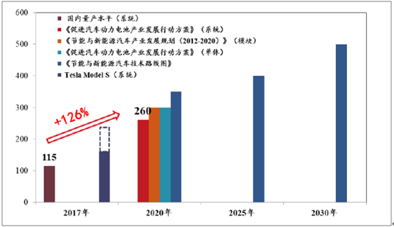 鼓勵動力電池向高能量密度技術方向發(fā)展:2017 年3 月發(fā)布的《促進汽車動力電池產業(yè)發(fā)展行動方案》,明確了到2020 年的目標是動力電池單體比能量超過300Wh/kg,系統比能量力爭達到260Wh/kg。我國目前的動力電池系統比能量平均水平約為115Wh/kg,不260Wh/kg 的目標值仌有較大差距。因此,不斷更新電池技術,提升電池能量密度,將會是動力電池企業(yè)的核心競爭力。