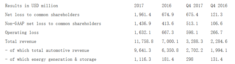 中國儲能網(wǎng)訊:特斯拉公司(Tesla Inc.)(納斯達(dá)克股票代碼:TSLA)2017年凈虧損額從2016年的6.749億美元擴(kuò)大至19.6億美元(合16億歐元),盡管同期營收大幅增長了68%。這家電動汽車和光伏產(chǎn)品制造商周三公布,根據(jù)非美國通用會計(jì)準(zhǔn)則對普通股股東的凈損失近14.4億美元。該公司表示:“到2018年的某個時候,我們預(yù)計(jì)將持續(xù)創(chuàng)造季度正盈利?!?