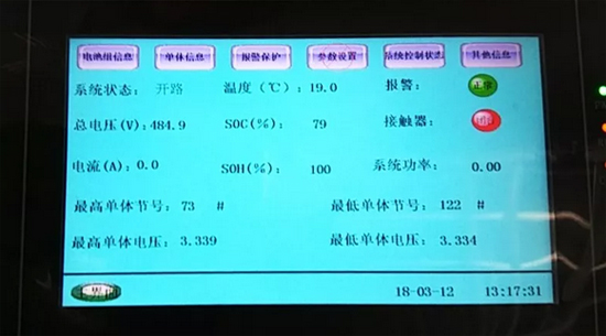 該系統(tǒng)由144個(gè)120Ah電芯串聯(lián)而成,配備可視化的人機(jī)操作界面。系統(tǒng)有離網(wǎng)和并網(wǎng)兩種工作模式,并離網(wǎng)轉(zhuǎn)換時(shí)間≤80ms,轉(zhuǎn)換過程不會(huì)影響用戶的正常用電需求。其電池管理系統(tǒng)具有信息采集、判斷、處置功能,可對(duì)電芯電壓、溫度、電流等進(jìn)行有效管理。
