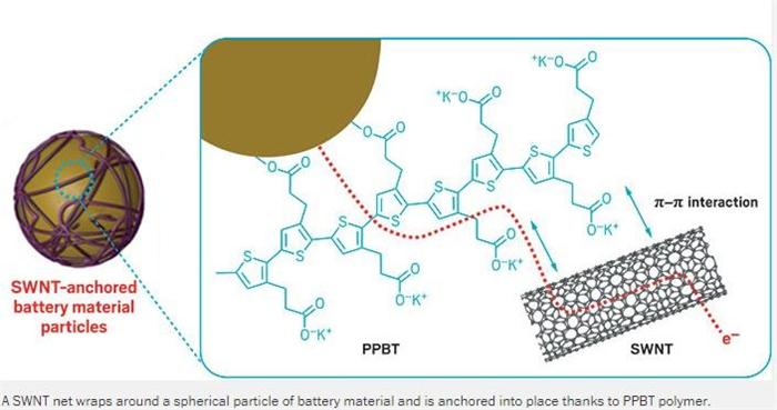 該團(tuán)隊(duì)由喬治亞理工大學(xué)(Georgia Tech)的Elsa Reichmanis及紐約州立大學(xué)石溪分校(Stony Brook University)的Amy C. Marschilok牽頭,制作了單壁碳納米管(single-walled carbon nanotube,SWNT)網(wǎng)狀結(jié)構(gòu),可利用PPBT(poly[3-(potassium-4-butanoate) thiophene])將SWNT固定在電池材料上。