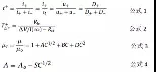 其中,μr是相對粘度,μ是溶液粘度,μ0是純?nèi)軇┱扯?,C是鋰鹽濃度,A、B、D是系數(shù),Λ是摩爾電導(dǎo)率,Λ0是在無限稀釋狀態(tài)下的摩爾電導(dǎo)率,S是受溶劑物理性質(zhì)和電解質(zhì)性質(zhì)影響的參數(shù),C是溶質(zhì)濃度。如果鋰鹽和溶劑的種類變化之后,經(jīng)驗公式也需要進行修改。對于混合體系電解液來說,公式會更加復(fù)雜。