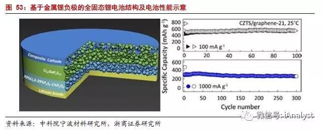 圖53為中科院寧波材料所(姚霞銀團(tuán)隊)提出的固態(tài)鋰電池設(shè)計改進(jìn)示意:以高鋰離子電導(dǎo)率的Li10GeP2S12和對金屬鋰穩(wěn)定的Li7P3S11構(gòu)建雙電解質(zhì)異質(zhì)結(jié)構(gòu),實(shí)現(xiàn)金屬鋰負(fù)極在固態(tài)電池中的應(yīng)用。另外,該團(tuán)隊采用納米結(jié)構(gòu)的多元金屬硫化物Cu2ZnSnS4作為正極活性材料,顯著抑制了氧化物正極與硫化物電解質(zhì)因空間電荷層效應(yīng)導(dǎo)致的高界面阻抗;同時復(fù)合石墨烯構(gòu)建電子通道,有效提高其循環(huán)穩(wěn)定性,并獲得優(yōu)異的倍率性能,在100和1000mA/g電流密度下循環(huán)100和300圈仍可分別保持高達(dá)544.6和233.9mAh/g的放電比容量。