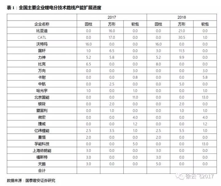 2017年方形、圓柱、軟包三種類型電池產(chǎn)能分別達到68.5GWh、63GWh、23GWh,占比分別為45%、41%、15%。2018年底全行業(yè)總產(chǎn)能將達到182GWH,根據(jù)我們的產(chǎn)業(yè)分析顯示,其中方形產(chǎn)能達到93.5GWh、圓柱產(chǎn)能50.5GWh和軟包產(chǎn)能達到38GWh,占比分別達到51%、28%、21%。