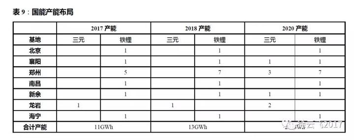 2017年總產(chǎn)能達到11GWh,目前磷酸鐵鋰軟包電池產(chǎn)能占比90%,其余為三元軟包,預計2018年將在鄭州繼續(xù)擴產(chǎn),總產(chǎn)能達到13GWh,公司規(guī)劃2020年總產(chǎn)能升至20GWh,未來國能磷酸鐵鋰電池和三元電池的產(chǎn)量也會根據(jù)市場情況靈活調(diào)整,比例約為6:4。