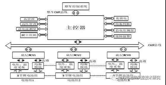 動力電池管理系統(tǒng),只有一層集中式或者兩分布式,基本不會出現(xiàn)三層的情況。小型車主要應(yīng)用一層集中式電池管理系統(tǒng)。兩層的分布式動力電池管理系統(tǒng),如下圖所示。