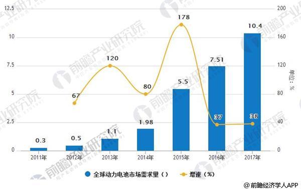 2011-2017年全球動(dòng)力電池市場(chǎng)需求量及增速情況