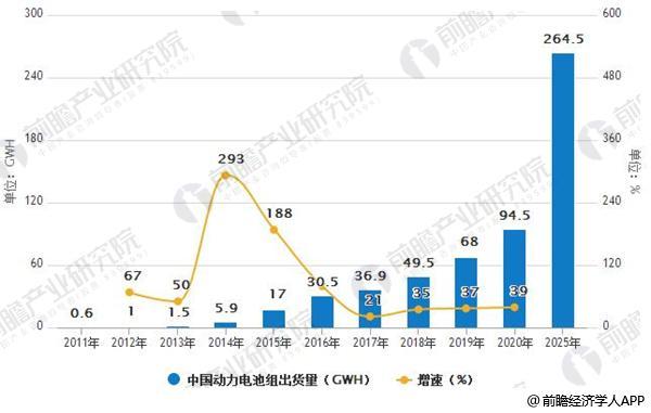 2011-2025年中國(guó)動(dòng)力電池組出貨量及增速情況