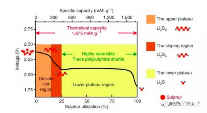 以硫放電過程為例,簡單可以分為兩個階段,首先固態(tài)單質硫S8與Li+生成液態(tài)的Li2S8,隨著放電程度的深入會經過可溶性Li2S6最終生成可溶性Li2S4,對應電壓平臺2.4 V - 2.1V,此過程由于有液態(tài)物質的生成,反應速度較快。接著隨著進一步的放電,在2.1 V電壓平臺處,可溶性Li2S4轉化成不溶性的固相 Li2S2,最后再進一步生成終產物固相的Li2S,由于這一階段中固體開始生成,使得離子擴散變慢,所以反應速度較緩。不同于傳統(tǒng)的鋰離子電池材料,鋰硫電池充放電時單質硫和硫化鋰中間經過多硫化鋰Li2Sx(x=2-8)而并不是通過鋰離子在正極材料和負極材料之間的往返嵌入和脫嵌來實現充放電的,因此鋰硫電池性能受正極材料的鋰離子脫嵌能力影響小。