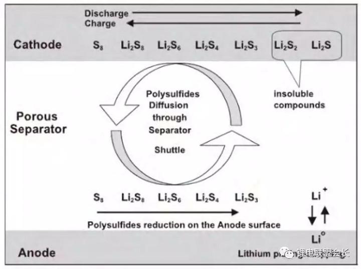 (2)多硫化鋰穿梭效應:在鋰硫電池充放電過程中,長鏈多硫化鋰Li2Sx(4<x≤8)會溶解至電解液中,穿過隔膜,達到負極并被還原成短鏈的多硫化鋰Li2Sx(2<x≤4)和不可溶的Li2S2、Li2S,腐蝕負極。其中可溶性的多硫化鋰還會穿過隔膜重新回到正極,這種來回穿梭的現象被稱為多硫化鋰的穿梭效應,如圖所示。此效應將導致鋰硫電池的活性物質自放電,造成材料庫侖效率不高。