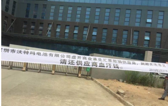 在深圳市坪山新區(qū)的工業(yè)園中,沃特瑪總部大樓屬于非常顯眼的建筑,高高懸掛在大樓上方的沃特瑪三個大字,宣告著它往日的輝煌。但是,在《中國汽車報》記者面前,緊緊關閉的伸縮門與筆直站立并不斷觀察周圍情況的保安又讓人不得不面對現(xiàn)實。3月25日,供應商正是圍堵這座大門,并拉出“深圳市沃特瑪電池有限公司虛開商業(yè)承兌匯票欺騙供應商,到期無法承兌,請還供應商血汗錢”的橫幅,場面堪稱混亂。