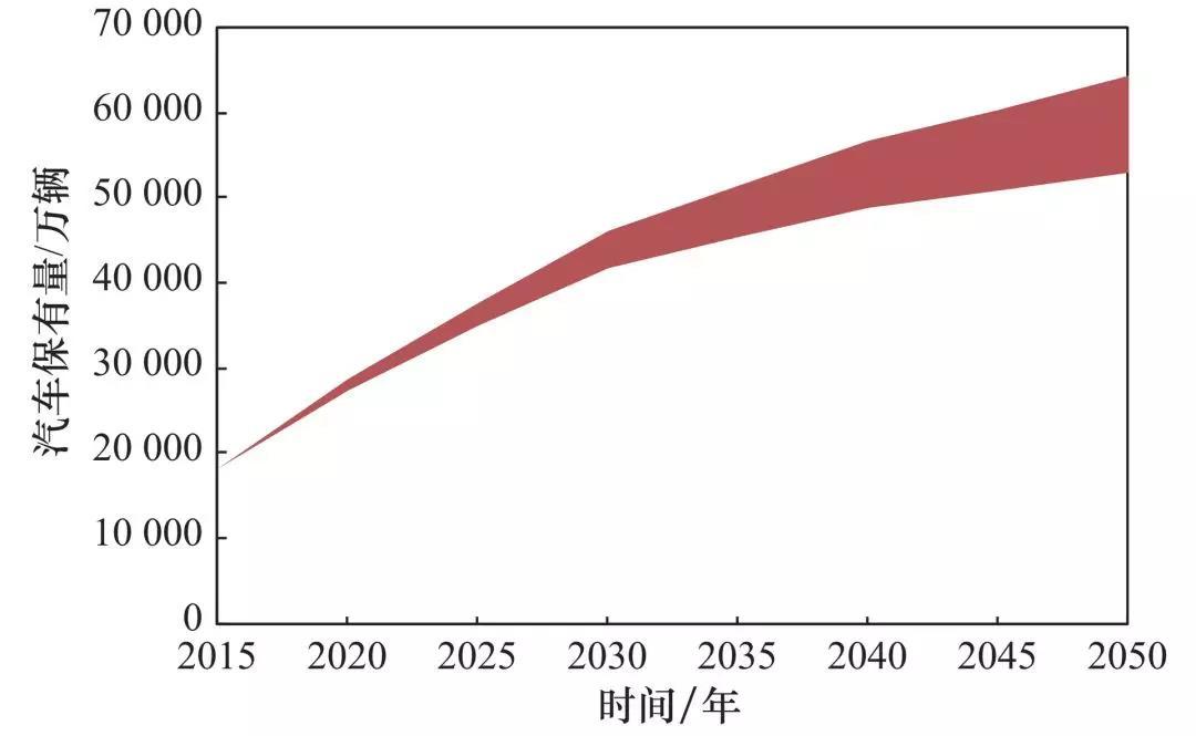注:帶狀圖表示汽車保有量預(yù)測范圍,由于未來經(jīng)濟(jì)、人口和城鎮(zhèn)化率等驅(qū)動因素的不確定性,未來汽車保有量的預(yù)測存在一定變動范圍