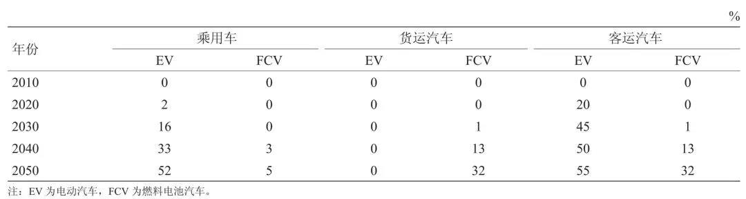 隨著新能源汽車技術(shù)進(jìn)步、成本下降及基礎(chǔ)設(shè)施的不斷完善,新能源汽車市場份額將快速增長,電動汽車將逐步替代部分乘用車和大型客車,燃料電池汽車將逐步替代部分乘用車和部分大型客運(yùn)和貨運(yùn)汽車。如果新能源汽車得到大力發(fā)展,根據(jù)模型測算結(jié)果, 2020 年、 2030 年、 2050 年將可分別替代成品油 9.33 × 10^6 toe、 5.71 × 10^7 toe、 1.87 × 10^8 toe 左右。新能源汽車大力發(fā)展時的占比,如表 1 所示。