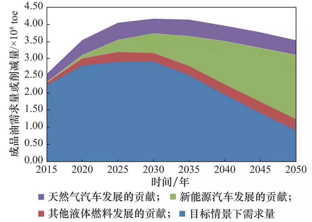 圖 2 大力發(fā)展燃料替代與新能源汽車對汽車成品油需求削減量的貢獻(xiàn)