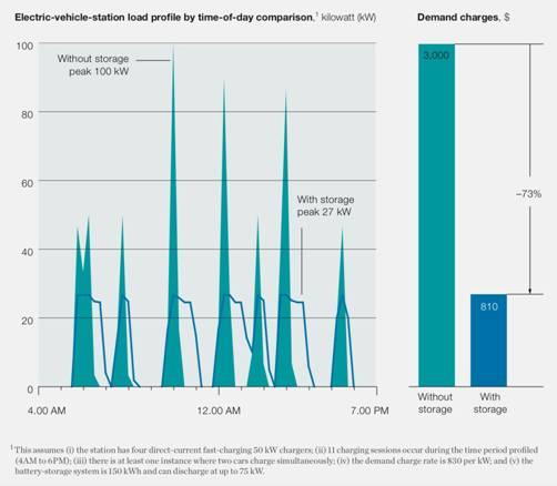 麥肯錫的分析表明,電池可以將需求費用降低73%,平衡過程中的負載峰值,并使充電站更實惠。