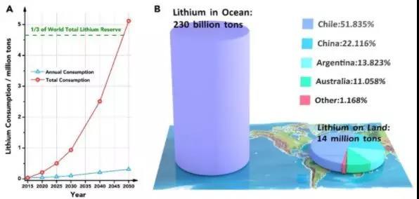 圖1:(A)鋰資源在2015~2050年間的預(yù)期年消耗量和總消耗量曲線;(B)海洋和陸地中鋰資源儲量對比圖,陸地上鋰資源分布不均,主要分布在智利、中國、阿根廷和澳大利亞。