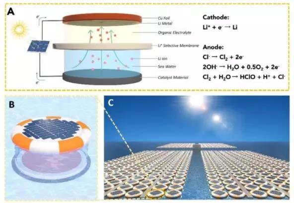 圖2:(A)太負(fù)能驅(qū)動的電解法海水提鋰裝置原理示意圖;(B)裝置單體示意圖,自上而下分別為太負(fù)能板、有機電解液正極區(qū)、陶瓷選擇性膜、海水負(fù)極區(qū),整個裝置可以利用橡皮圈浮于海面;(C)海上大量裝置排列的假想圖。