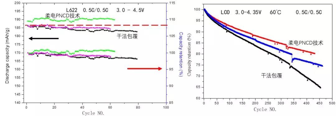 中國儲能網(wǎng)訊:近日,柔電科技在廣州舉行的2018年亞洲動力電池與儲能技術(shù)峰會上,提出了高容量、高電壓、耐高溫鋰電池材料的解決方案。通過自主開發(fā)的精準(zhǔn)納膜包覆與摻雜技術(shù)(Precise Nano Coating and Doping, 簡稱PNCD),可以大幅提升現(xiàn)有鋰電池正負(fù)極材料的循環(huán)性能、耐高電壓性能以及耐高溫性能。通過和國內(nèi)外多家知名材料企業(yè)的合作,該技術(shù)在高電壓4.5V鈷酸鋰、4.5V中鎳三元(532和622型)、常壓高鎳三元(811和NCA型)以及富鋰錳基都顯示出比同類產(chǎn)品性能有明顯的提升。通過該技術(shù),LiCoO2電池截止電壓可以提升到4.5 V,在0.1C電流密度下容量接近200mAh/g,C/2的倍率下容量達(dá)到190 mAh/g,100圈以后容量保持在95%以上。而532和622三元的中鎳高電壓(4.5V)容量達(dá)到~190mAh/g, 循環(huán)100次后衰減<1%。 而811三元在45度下循環(huán)壽命可達(dá)到1200圈,未處理的811材料只有600圈;而24小時(shí)脹氣率也只有未處理電池的60%(以上數(shù)據(jù)均來自于軟包電池)。