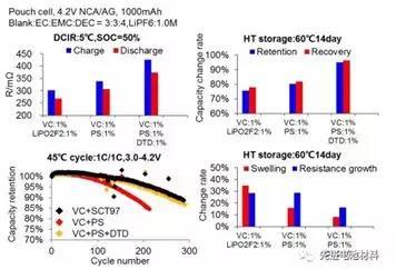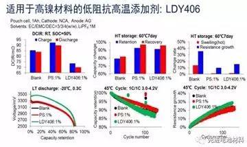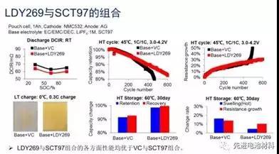 在三元材料動力電池中,最常用的兩款經(jīng)典添加劑是VC和PS,可以顯著改善電池的高溫存儲性能和循環(huán)性能,但是最大缺陷是會顯著增大阻抗,降低功率和低溫性能。針對這種情況,新宙邦開發(fā)了低阻抗的新型負極成膜添加劑LDY269和鋰鹽型添加劑SCT97。