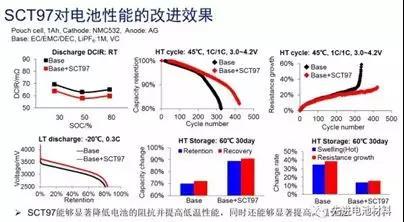 而鋰鹽型添加劑SCT97能夠顯著降低電池的內(nèi)阻,提高低溫性能,且能夠顯著提高高溫儲存性能。用于正極為NMC532的電池時,SCT97的效果要顯著優(yōu)于PS。