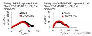 其中,新型負極成膜添加劑LDY269添加劑特點是在負極上成膜時界面阻抗會有所降低,不會象VC一樣增大負極的界面阻抗。