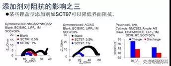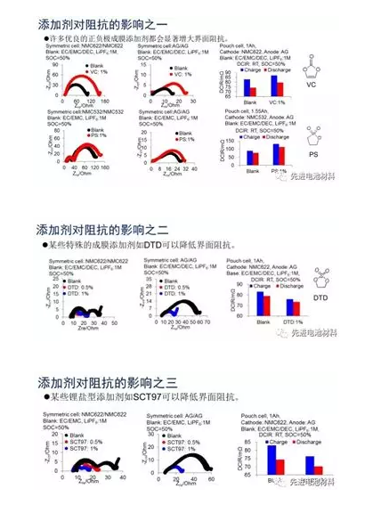 目前,添加劑對阻抗的影響有三種典型的類型:一是很多優(yōu)良的正負極成膜添加劑會顯著增大界面阻抗,如最常用的性能優(yōu)異的正負極成膜添加劑VC和PS都會明顯增加正負極的界面阻抗;二是一些特殊的成膜添加劑在一定情況下可以降低界面阻抗,如DTD;三是一些鋰鹽型添加劑可以顯著降低界面阻抗,如SCT97。詳情請看下圖。