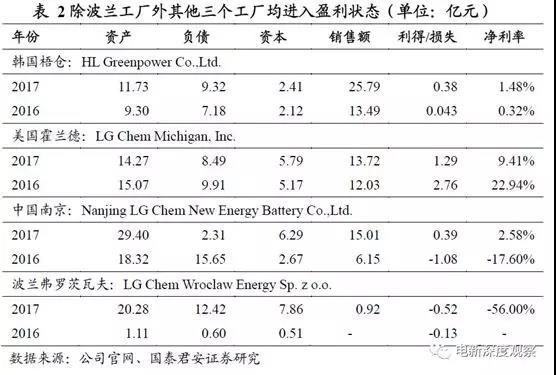 單看LG化學(xué)動(dòng)力電池業(yè)務(wù),盈利情況也不樂觀,韓國梧倉、美國霍蘭德、中國南京、波蘭弗羅茨瓦夫四大工廠2016年、2017年利潤及凈利率偏低,波蘭弗羅茨瓦夫一直處于虧損狀態(tài);四家工廠2017年銷售額共55.44億元,利潤1.54億元,詳細(xì)數(shù)據(jù)如下: