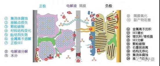 電池關(guān)鍵材料:正極材料的微裂紋與破碎、負極材料的破壞與表面SEI過厚、電解液老化、活性物質(zhì)與集流體脫離、活性物質(zhì)與導電添加劑的接觸變差(包括導電添加劑的流失)、隔膜縮孔堵塞、電池極耳焊接異常等。