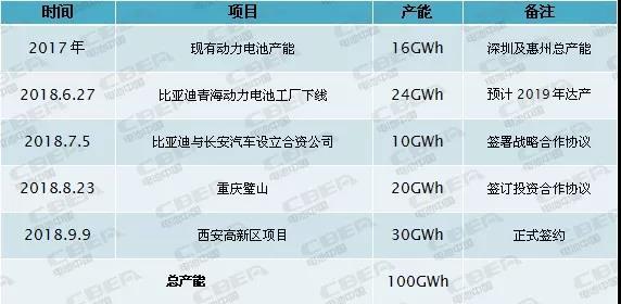 據(jù)電池中國(guó)網(wǎng)了解,截止到2017年年底,比亞迪動(dòng)力電池的總產(chǎn)能是16GWh,其中6GWh是三元電池,10GWh是磷酸鐵鋰電池;2018年6月27日,比亞迪規(guī)劃產(chǎn)能24GWh的青海動(dòng)力電池工廠正式下線,預(yù)計(jì)2019年全部投產(chǎn);7月5日,比亞迪與長(zhǎng)安汽車簽署戰(zhàn)略合作協(xié)議,成立動(dòng)力電池合資公司,規(guī)劃產(chǎn)能10GWh;8月23日,比亞迪與重慶璧山區(qū)政府就動(dòng)力電池年產(chǎn)20GWh產(chǎn)業(yè)項(xiàng)目簽訂投資合作協(xié)議;9月9日,比亞迪30GWh動(dòng)力電池項(xiàng)目簽約儀式在西安高新區(qū)舉行。至此,比亞迪動(dòng)力電池規(guī)劃總產(chǎn)能已達(dá)100GWh。動(dòng)力電池應(yīng)用分會(huì)統(tǒng)計(jì)數(shù)據(jù)顯示,2017年全國(guó)動(dòng)力電池出貨量才不過44.66GWh,而僅僅比亞迪一家其簽約產(chǎn)能就超過了這一數(shù)字的兩倍,更何況還有動(dòng)力電池出貨量在比亞迪之上的寧德時(shí)代!
