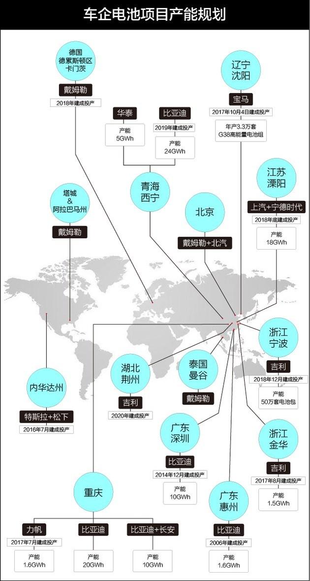 比如,2017年6月19日,上汽集團與寧德時代在江蘇常州溧陽的電池生產(chǎn)基地正式奠基,項目一期今年底可實現(xiàn)投產(chǎn),年產(chǎn)能可達18GWh,待2020年項目全部投產(chǎn),將形成36GWh年產(chǎn)能。