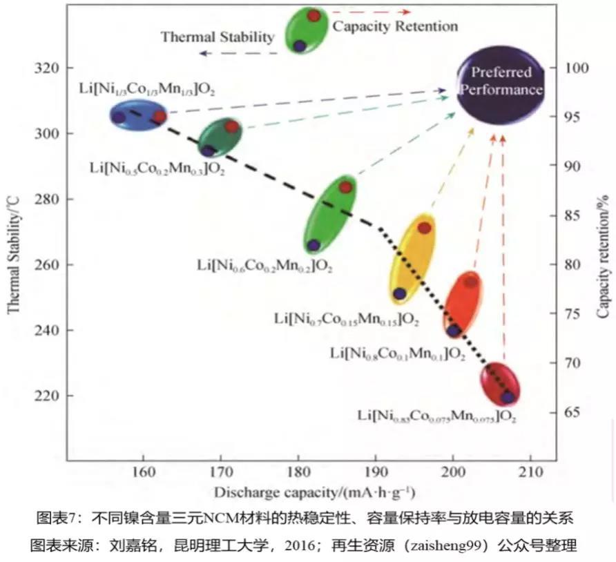 目前鋰離子動力電池在乘用車和商用車應(yīng)用較多的分別是三元電池、磷酸鐵鋰電池,三元電池向高安全和高能量密度方向發(fā)展,這實際上是矛盾的,三元NCM或NCA均往高鎳方向發(fā)展,能量密度隨之提高,但電池安全性也隨之降低。從圖7看出,高含量Ni4+容易氧化電解液,釋放氣體,破壞材料晶體結(jié)構(gòu),導(dǎo)致熱穩(wěn)定性下降,影響電芯安全性。