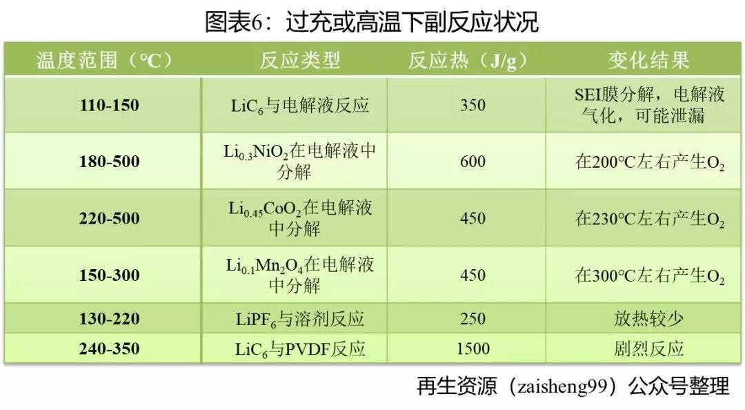 從鋰電材料組成來看,正極材料占比最高,它決定了電池的比容量和比能量,對比磷酸鐵鋰(LiFePO4)與三元材料NMC(LiNixMnyCo1-x-yO2)發(fā)現(xiàn),要提高安全性必定犧牲能量密度,影響安全性的重要因素是電極材料的本征電極電勢和晶體結(jié)構(gòu);負(fù)極材料對安全性的影響主要來自于鋰枝晶的生長導(dǎo)致的與電解液的反應(yīng),鋰枝晶不斷生長的原因是鋰離子通過SEI膜的速度小于鋰離子在負(fù)極上的沉積速度;電解液通常為有機(jī)碳酸酯類化合物,充電時不穩(wěn)定的正極材料發(fā)生副反應(yīng)釋放氧氣與電解液反應(yīng),放出大量熱和易燃?xì)怏w;隔膜材料一旦破裂將造成正負(fù)極接觸發(fā)生短路,導(dǎo)致熱失控。如表6所示,在過充和高溫下,正極活性材料與電解液中的溶劑發(fā)生反應(yīng)釋放氧氣并產(chǎn)生大量熱;溫度升高使得在嵌鋰狀態(tài)下的碳負(fù)極材料由有序變無序,極易與電解液或粘接劑(如PVDF)發(fā)生放熱反應(yīng);電解液溶劑(如PC/EC/EMC/DMC等)均為有機(jī)易燃物,高溫或一定電壓下發(fā)生氧化和分解反應(yīng);隔膜材料PE熔點135℃,PP熔點165℃,溫度超過熔點,隔膜融化,發(fā)生內(nèi)短路。