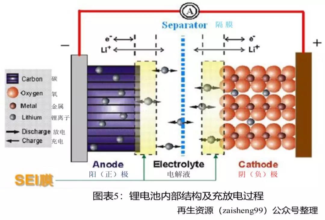 鋰離子動力電池的結(jié)構(gòu)首先決定了其安全性能的好壞,如圖5所示,鋰電材料由正極材料、負(fù)極材料、電解液及隔膜等組成,充放電過程實際上是一種電化學(xué)反應(yīng)過程,SEI膜是在電池首次充放電過程中電極材料與電解液反應(yīng)沉積在電極表面的一層鈍化膜,當(dāng)溫度過高(T>130℃)導(dǎo)致SEI膜分解,使電解液與裸露的高活性碳負(fù)極發(fā)生還原反應(yīng),產(chǎn)生大量的分解熱量使電池溫度升高,這是導(dǎo)致熱失控的反應(yīng)動力學(xué)原因,也是發(fā)生事故的根本原因,因此,改善SEI膜的熱穩(wěn)定性可以提高電芯的安全性。