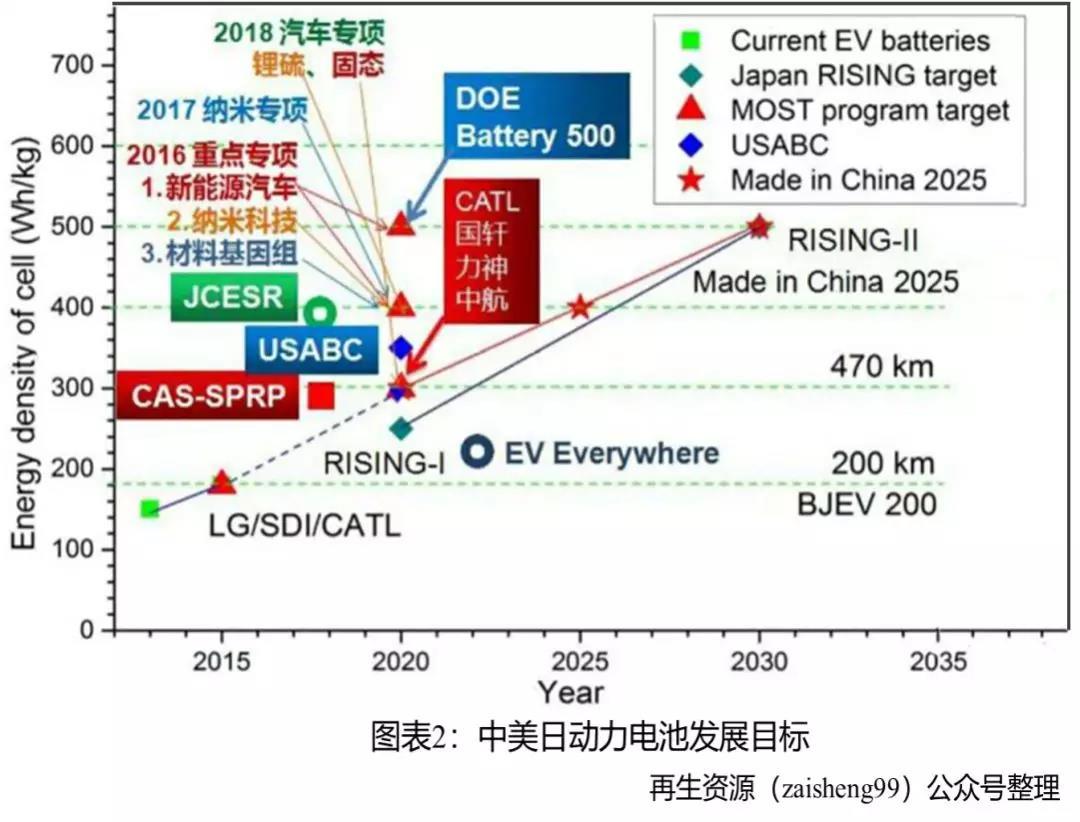 通常鋰電池在3C產(chǎn)品應(yīng)用較成熟,近年在新能源汽車和儲能領(lǐng)域存在爆發(fā)式的增長需求,目前我國儲能電池市場規(guī)模還沒完全釋放,而新能源汽車動力電池市場已成為各國爭相競技的賽場。從圖2看出,美國制定的長期目標(biāo)為開發(fā)能量密度>200Wh/kg的PHEV-100+和EV用二次電池,日本新能源產(chǎn)業(yè)技術(shù)綜合開發(fā)機(jī)構(gòu)(NEDO)計劃至2020年達(dá)到250Wh/kg,2030年達(dá)到500-700Wh/kg,中國規(guī)劃至2020年,新型鋰離子動力電池單體比能量超過300Wh/kg,系統(tǒng)比能量力爭達(dá)到260Wh/kg,至2025年,單體比能量達(dá)500Wh/kg。