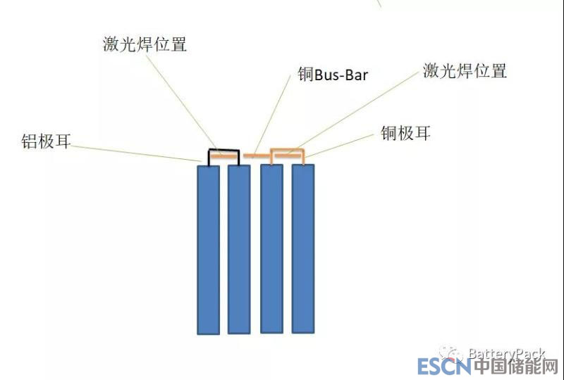 一種是回流排在下,極耳在上,通過(guò)焊穿極耳來(lái)和底部匯流排連接,另一種是極耳在下,匯流排在上,通過(guò)焊穿匯流排來(lái)和極耳連接。這兩種結(jié)構(gòu)都需要解決的一個(gè)難題是異種金屬激光焊接。這種焊接方式成組效率也很高,生產(chǎn)速度快。隨著異種材料激光焊接的成熟,越來(lái)越多的廠家采用這種焊接方案。