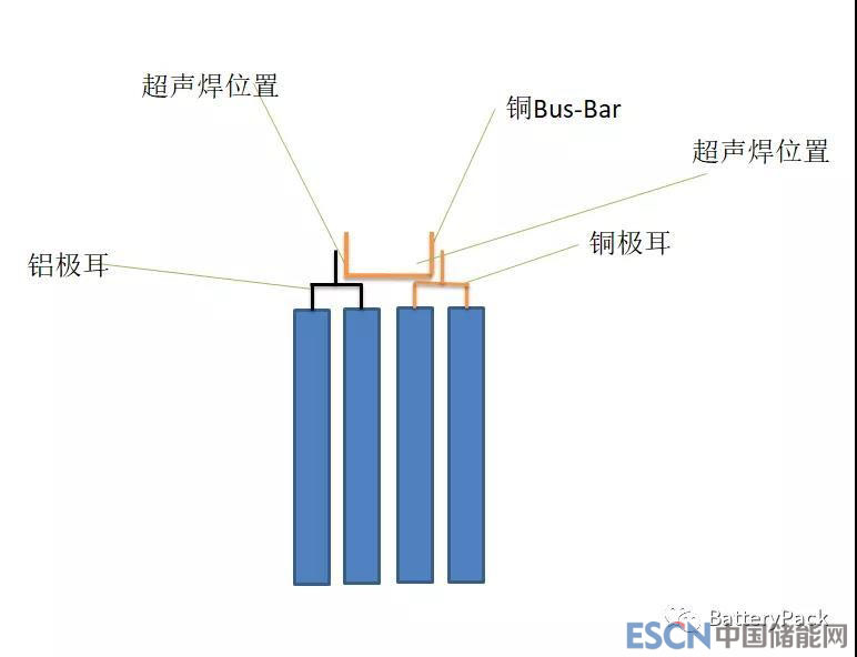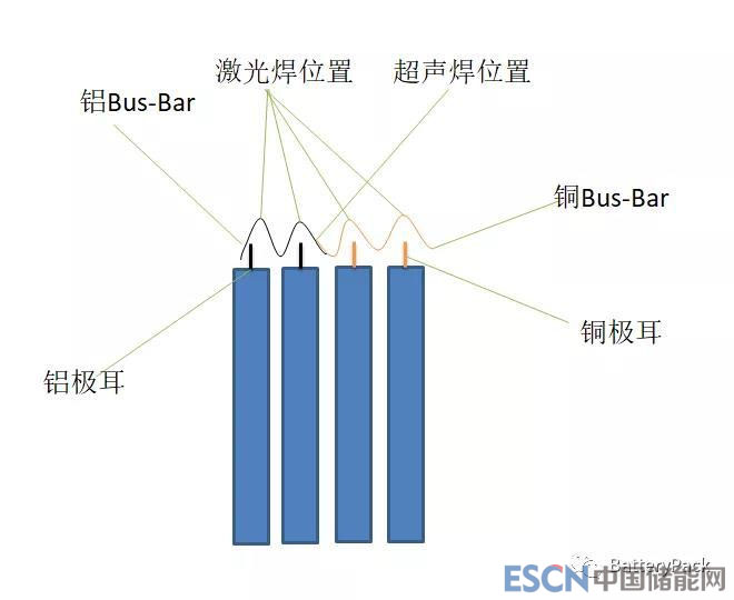匯流排是由銅薄板和鋁薄板通過(guò)超聲焊結(jié)合而成,加工成類(lèi)正弦波形狀,卡在電芯極耳處,銅匯流排處對(duì)應(yīng)的是負(fù)極極耳,鋁匯流排處對(duì)應(yīng)的是正極極耳,然后通過(guò)激光焊連接。