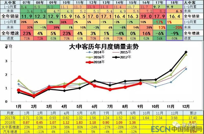 17年的大中客市場(chǎng)走勢(shì)是歷年波動(dòng)最大的,1-5月增速處于歷年低谷,6月開始改善較大,年末超強(qiáng)。18年1到5月份,大中客表現(xiàn)較強(qiáng),同比增長(zhǎng)出現(xiàn)高增長(zhǎng),增長(zhǎng)主要是因?yàn)樾履茉窜嚨膿屟a(bǔ)貼行情,同時(shí)也是目錄較好的。6-9月調(diào)整也是較合理的走勢(shì)。