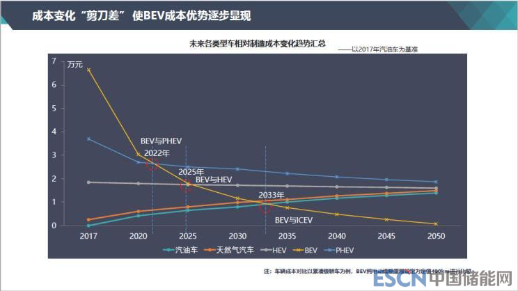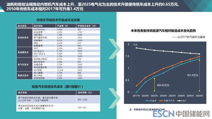 傳統汽油車的市場份額不斷下滑的原因之一在于其制造成本不斷增加,比如相對2017年的基準車型來說,2050年其制造成本將上升1.4萬元。