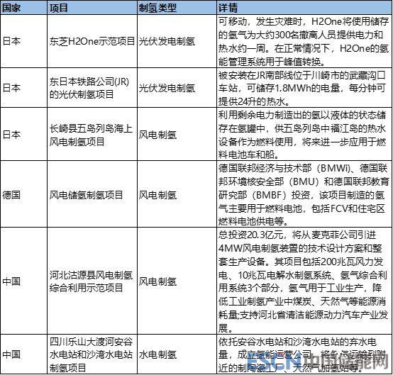 (3)國(guó)外產(chǎn)業(yè)示范案例。日本、德國(guó)已積極布局風(fēng)電、光伏發(fā)電制氫項(xiàng)目;國(guó)內(nèi)也開(kāi)始利用豐富的水電、風(fēng)電資源開(kāi)展制氫項(xiàng)目,見(jiàn)表1。
