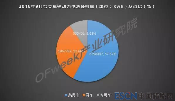 從車輛細(xì)分類別來看,2018年9月,我國新能源乘用車動(dòng)力電池裝機(jī)量約為3.30GWh,占比57.67%,新能源客車動(dòng)力電池裝機(jī)量約為1.87Gwh,占比32.66%,新能源專用車動(dòng)力電池裝機(jī)量約為0.55Gwh,占比9.68%。其中新能源客車裝機(jī)量超過8月裝機(jī)量1Gwh。