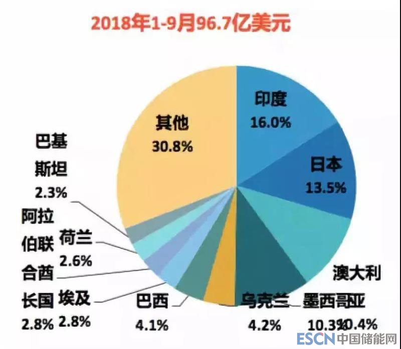 組件出口量為34GW,約為產(chǎn)量的61.9%,并已經(jīng)超過(guò)2017年全年的出口量。組件出口市場(chǎng)的集中度繼續(xù)降低,新興市場(chǎng)(南美、中東北非)為主的遍地開(kāi)花局面繼續(xù)發(fā)展;對(duì)歐洲主要市場(chǎng)荷蘭、德國(guó)等組件出口同比增長(zhǎng),烏克蘭市場(chǎng)增長(zhǎng)引人關(guān)注。對(duì)澳大利亞保持增長(zhǎng);對(duì)美國(guó)的組件出口僅為2533萬(wàn)美元,同比下降89.8%,出口量?jī)H為89MW。