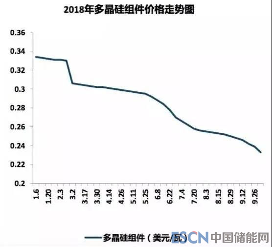 1-9月,組件產(chǎn)量54.9GW,同比增長(zhǎng)約3.58%;其中,上半年組件產(chǎn)量約42GW,增長(zhǎng)約24%。多晶組件價(jià)格趨勢(shì)如下: