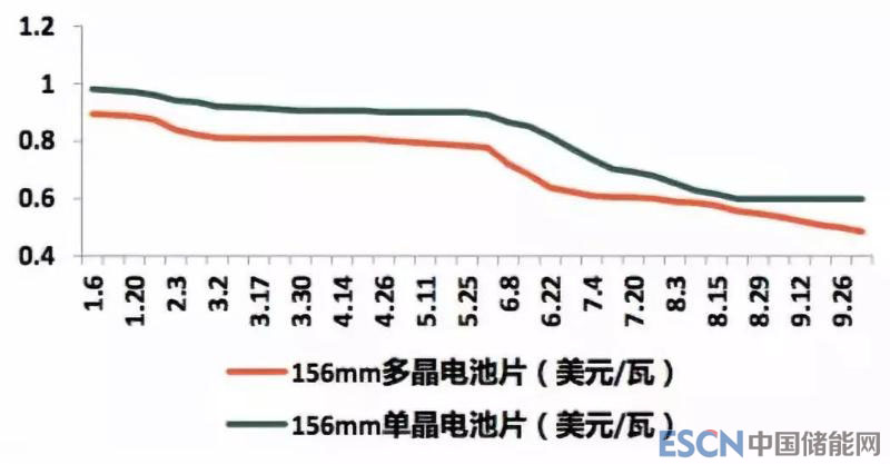 7月后,價(jià)格下滑幅度收窄,到10月單晶硅片3.15元,多晶硅2.13元。