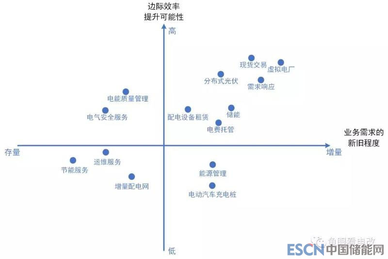 下面我們按照上述的兩個維度,對現(xiàn)有的一些綜合能源服務(wù)業(yè)務(wù)進行了定位,這只是一個示意圖,并不代表未來的趨勢和方向,僅供大家參考。