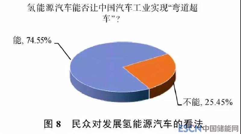 我國有世界上最龐大的汽車消費市場、對能源結構的轉型需求迫切、對氫燃料電池汽車的扶持政策十分優(yōu)越,且產業(yè)鏈也在加緊布局,這些條件都為氫能源汽車在中國的發(fā)展提供了最佳契機。在《調查》中發(fā)現(xiàn),有74.55%的人認為通過發(fā)展氫能源汽車能讓中國的汽車企業(yè)實現(xiàn)"彎道超車”(如圖8),也就是將近有3/4的人對氫能源汽車的發(fā)展持樂觀態(tài)度。希望中國能盡快實現(xiàn)氫能汽車的產業(yè)化,相信中國也一定能通過自己的努力從汽車大國轉變成汽車強國。