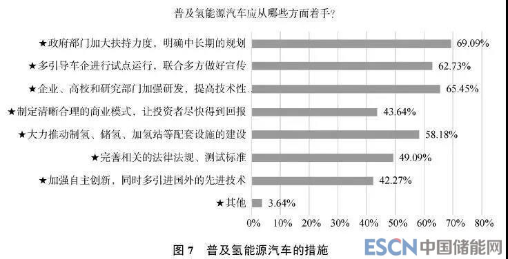 汽車產業(yè)牽涉到科技、文化、經濟等多個社會領域,代表著國家的發(fā)展意志,因此政府的政策支持與引導就顯得尤為重要?!墩{查》中顯示,對于普及氫能源汽車應從哪些方面著手?(如圖7)超過半數(shù)的民眾都支持以下幾個方面:①政府部門加大扶持力度,明確中長期的規(guī)劃;@企業(yè)、高校和研究部門加強研發(fā),提高技術性能,同時降低生產成本;③多引導車企進行試點運行,聯(lián)合多方做好宣傳;④大力推動制氫、儲氫、加氫站等配套設施的建設。由此可見,普及氫能源汽車,人們認為對政策、科技和基礎設施的投入最為重要。